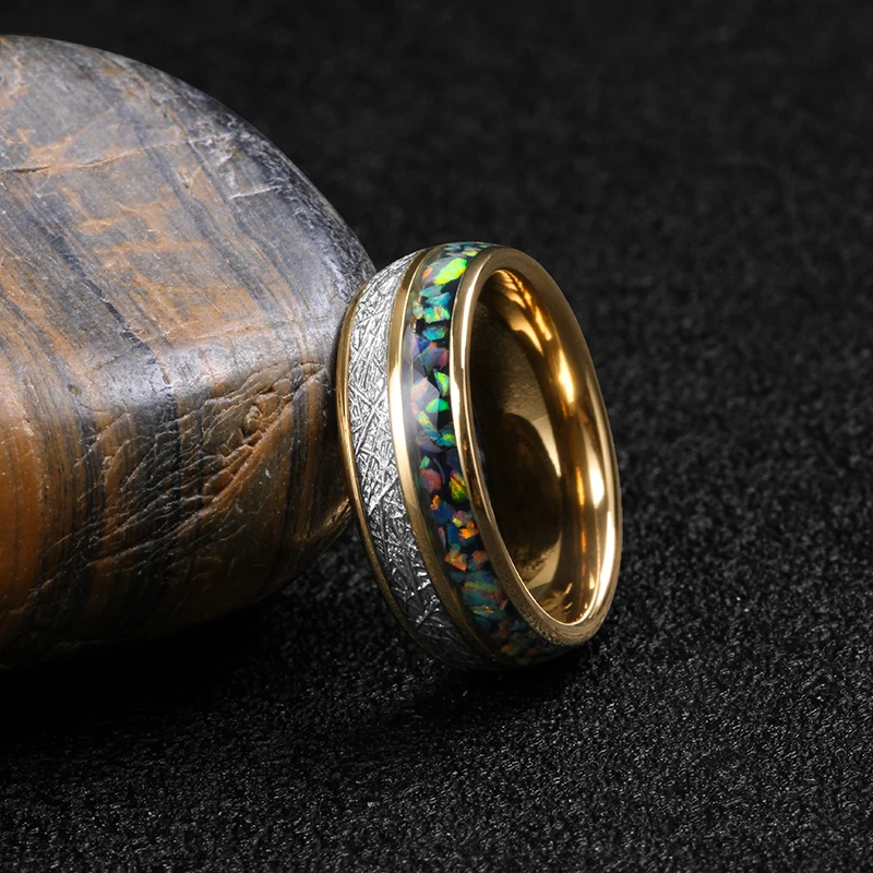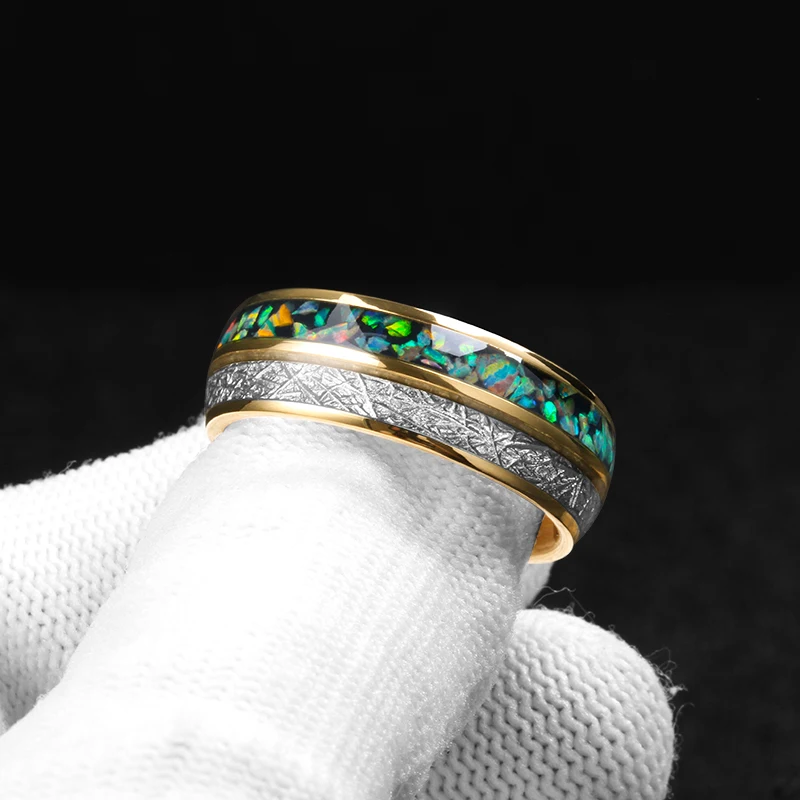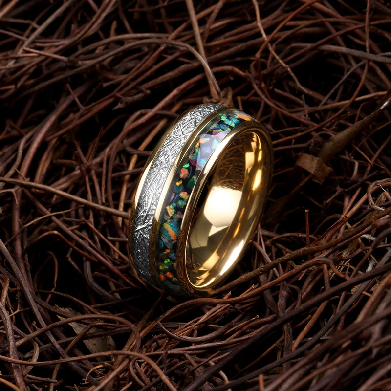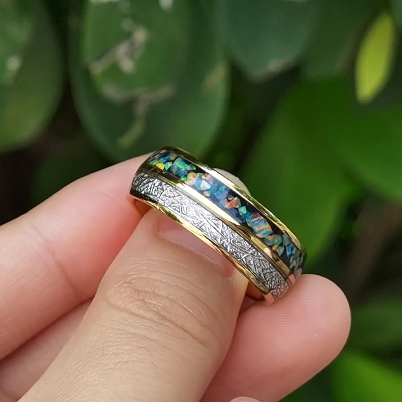 8mm Trendy Style Titanium Opal Artificial Meteorite Yellow Gold Plated Tungsten Ring Jewelry